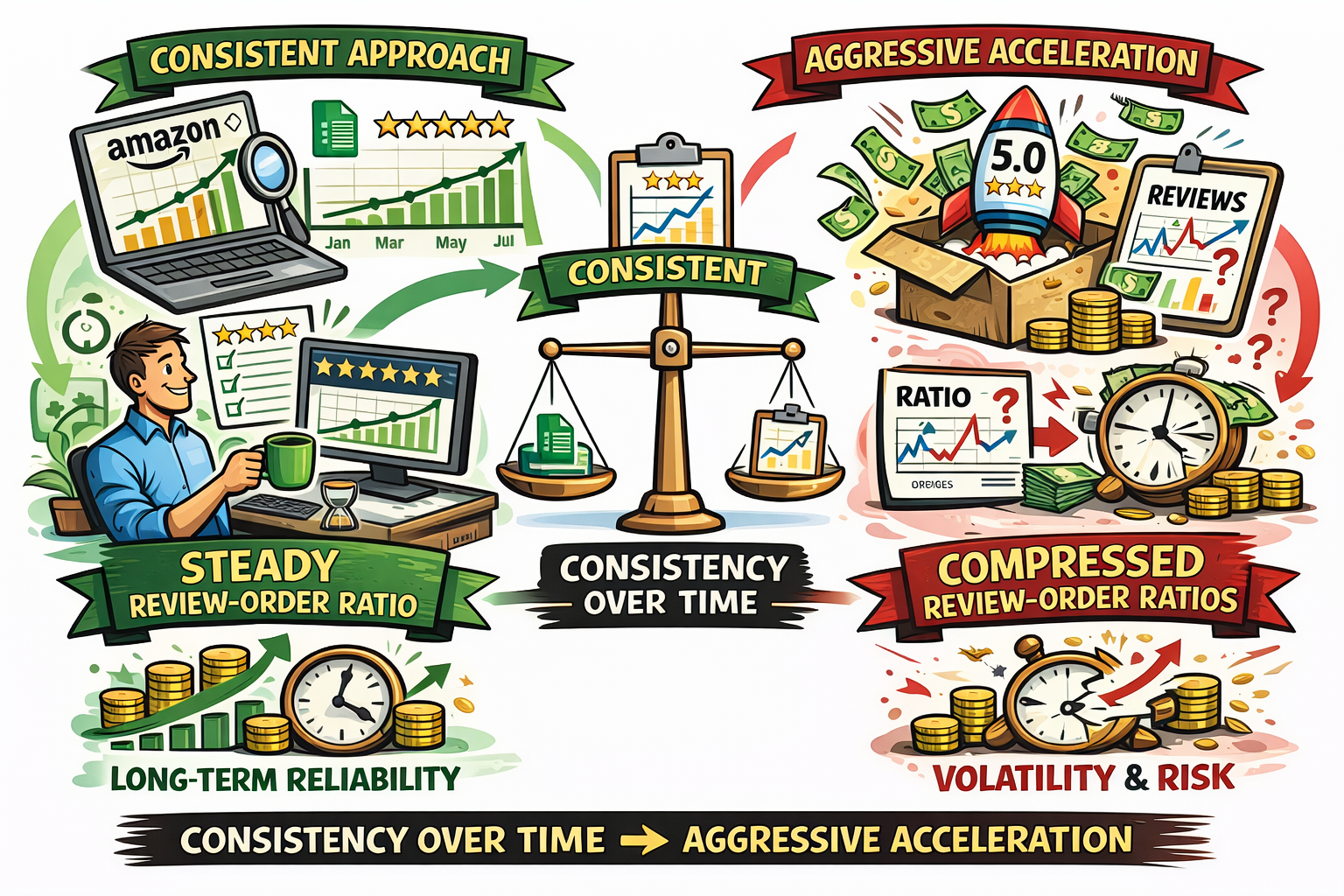 Listings that repeatedly compress their review-to-order ratio, tighten rating distribution abruptly, or stack acceleration tactics tend to experience later volatility, even if each individual tactic appears technically compliant.